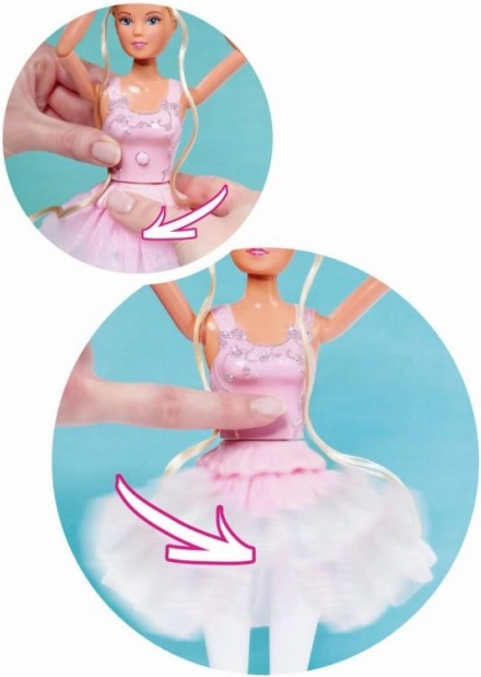 Objevte kouzlo baletu s panenkou Lalka Steffi Love – tančící balerína. Má otáčející se tylovou sukýnku na tlačítko ve tvaru růže, pohyblivé paže v loktech i zápěstích pro ladné pózy a v balení najdete i roztomilého králíčka v sukýnce. Ideální pro kreativní hru a milovnice tance.