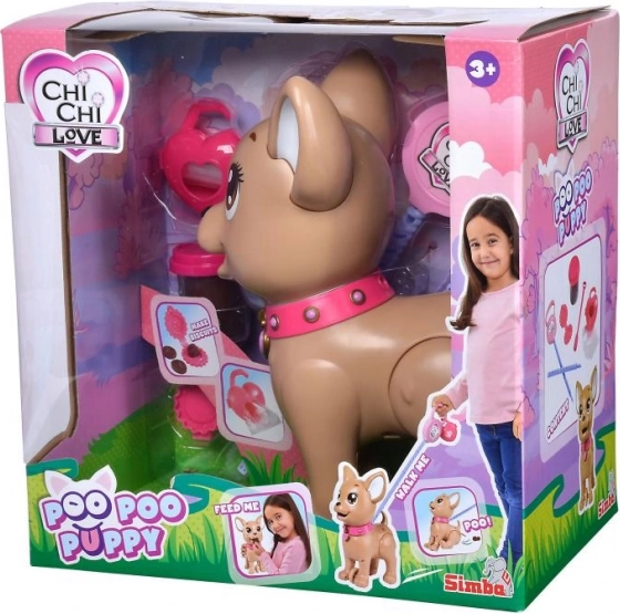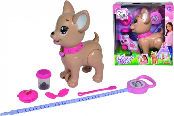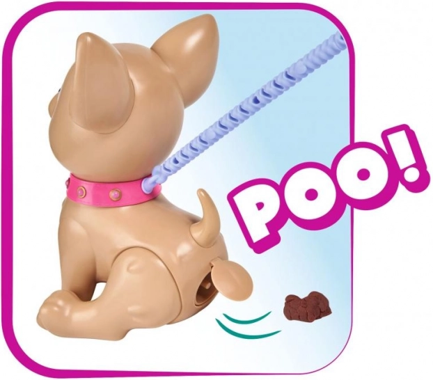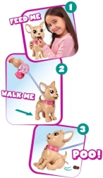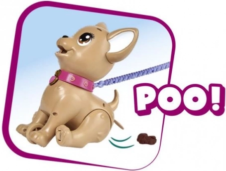 Interaktivní pejsek čivava Poo Poo od CHI CHI LOVE přináší dětem realistickou a zároveň bezpečnou hru na chov mazlíčka. Vyrobte pochoutku z modelíny, nakrmte pejska a vyrazte na procházku – po jemném zatlačení na vodítko pejsek pokrčí zadní nožičky a udělá hromádku, kterou lze snadno uklidit pomocí přiložených sáčků.