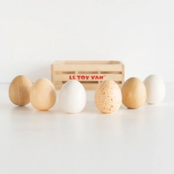 Šest dřevěných vajec v pevné bedýnce s úchyty přináší autentický zážitek z vaření a nakupování. Ideální rozšíření dětské kuchyňky a prodejního stánku.