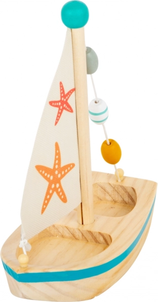 Stylová dřevěná plachetnice s potiskem hvězdic je připravena na vodní dobrodružství ve vaně, u bazénu i u moře. Má plovoucí trup, dekor dřevěných korálků a dostatek místa pro vlastní figurky. Skvělá ekologická alternativa k plastovým hračkám, vhodná od 24 měsíců. Rozměry 17 × 8,5 × 20 cm.