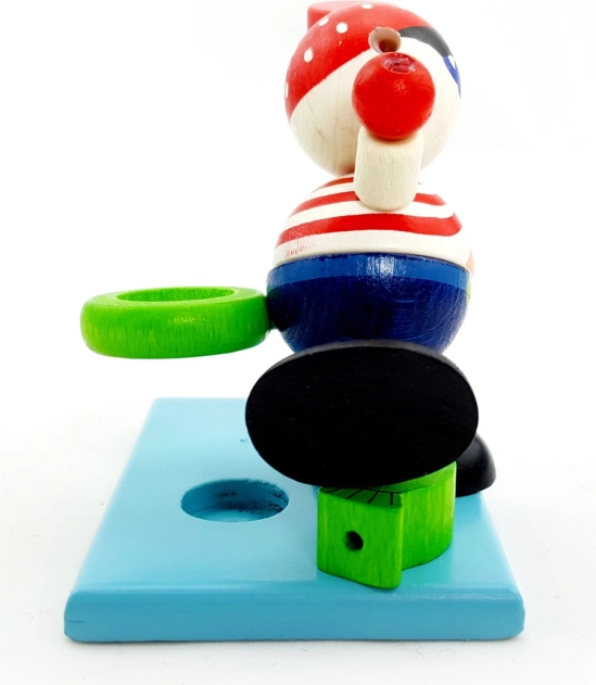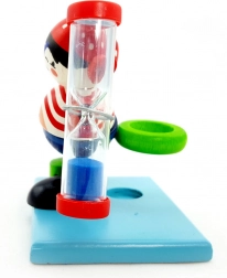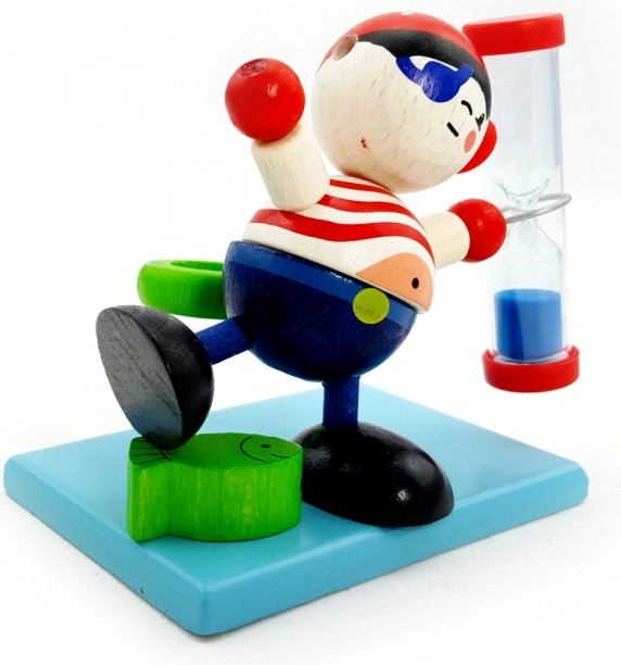 Motivujte děti k pravidelnému čištění zubů zábavnou formou. Dřevěný pirát s přesýpacími hodinami s modrým pískem spolehlivě odměří doporučené 2 minuty, zatímco integrovaný držák na zubní kartáček udrží koupelnu přehlednou.