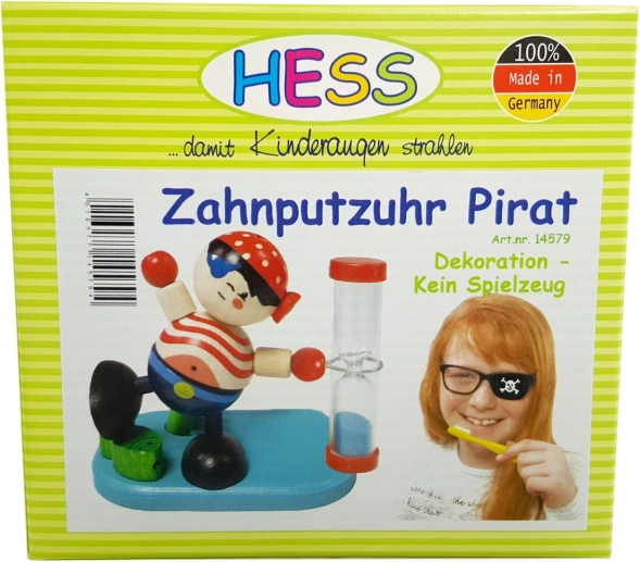 Zpříjemněte dětem každodenní hygienu s hravými přesýpacími hodinami ve tvaru piráta od značky HESS. Hodiny měří ideální 2 minuty čištění, mají praktický držák na zubní kartáček a jsou vyrobeny z kvalitního neošetřeného dřeva v Německu.