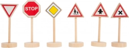 Sada 25 dřevěných dopravních značek a doplňků (např. kužely) pomáhá dětem pochopit pravidla silničního provozu v realistických herních scénářích. Díky čitelným symbolům a stabilním podstavcům se s nimi dobře manipuluje a jsou skvělým doplňkem k dopravním kobercům i vláčkodráhám.