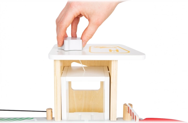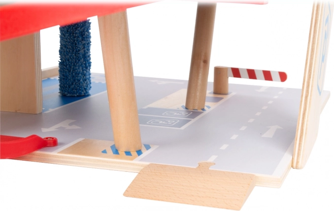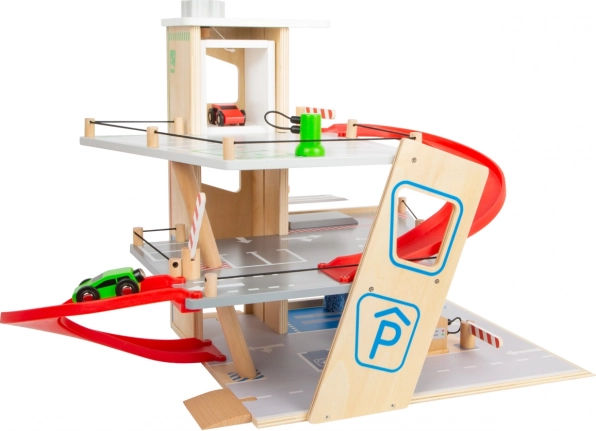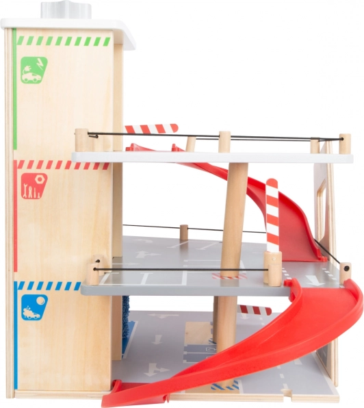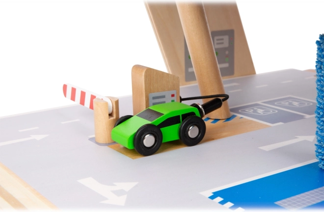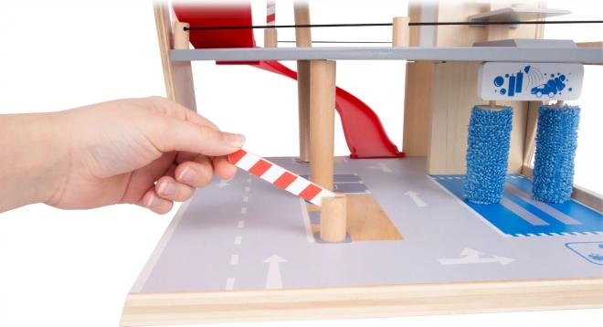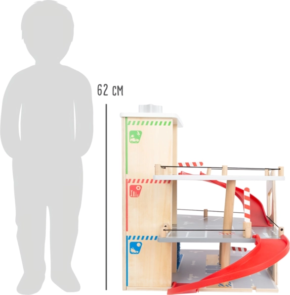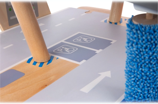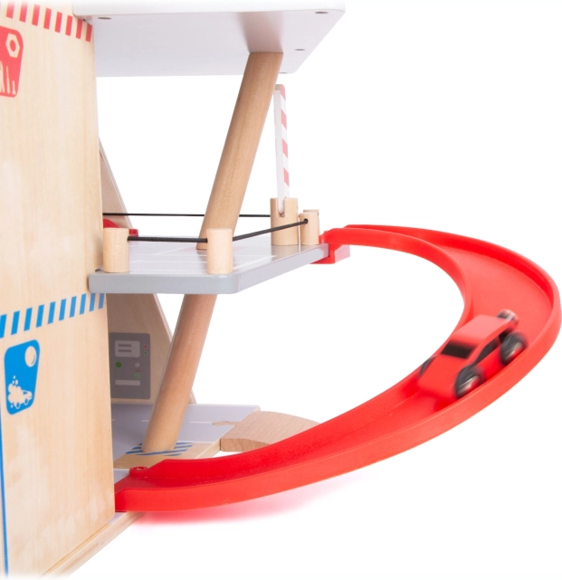Objevte robustní dřevěné parkoviště se třemi patry, funkčním výtahem a plynulými rampami pro nekonečné hry s autíčky. Součástí jsou dvě auta, čerpací stanice, nabíječka pro elektromobily, zvedací rampa, realistická automyčka s kartáči i mechanické závory v každém patře. Bezpečnou jízdu zajišťuje gumové hrazení a detailní značení rozvíjí dopravní povědomí.