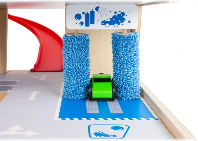 Myčka s otočnými kartáči dodá hře realističnost, zatímco gumové hrazení v patrech brání vypadnutí autíček a zvyšuje bezpečí při jízdě.