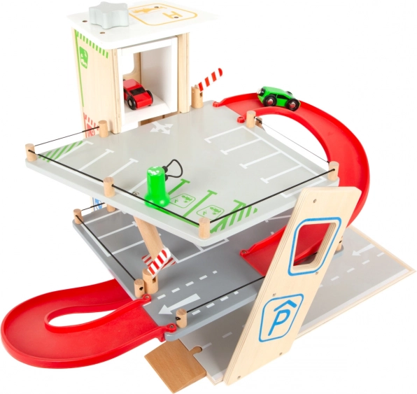 Součástí setu jsou 2 autíčka, pumpa, nabíjecí stanice, zvedací rampa, automyčka s kartáči a tři závory. Patra mají gumové hrazení proti vypadnutí vozidel a povrchy jsou bohatě označeny ikonami a dopravním značením. Konstrukce je pevná, odolná a bezpečná, vyžaduje jednoduchou montáž s obrázkovým návodem.