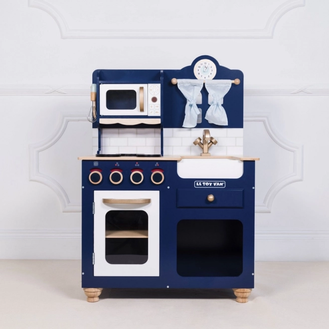 Stylová dětská kuchyňka z kvalitního dřeva v odstínu královské modři se zlatavými akcenty přináší dětem hodiny kreativní a představivé hry. Nabízí otevírací troubu, otočné knoflíky, dřez, mikrovlnku, roztomilé okénko se závěsy a hodiny s otočnými ručičkami. Součástí balení jsou dřevěné doplňky – metlička, vařečka, solnička a pepřenka. Vyrobeno eticky z udržitelného dřeva a malováno netoxickými barvami na vodní bázi.