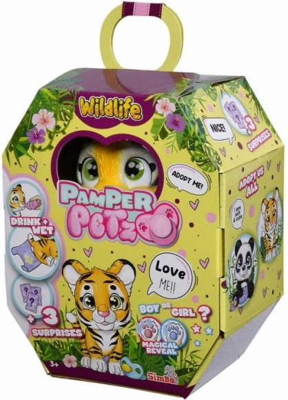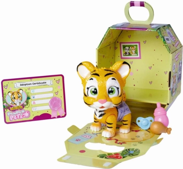 Objevte kouzlo s roztomilým tygříkem Pamper Petz! Tento interaktivní tygr s plenkou je navržen tak, aby děti mohly objevovat svět péče o zvířátka a zažít radost z adopce svého nového kamaráda. Tygr disponuje funkcemi, které mu umožňují pít vodu z lahvičky a čurat do plenky, která mění barvu podle vlhkosti.