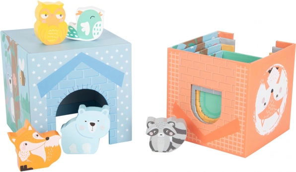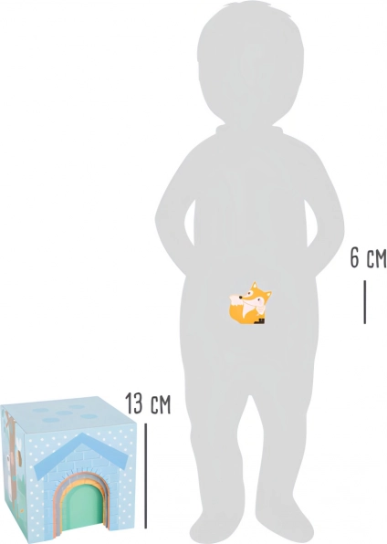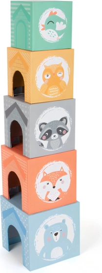 Kostky lze stavět do vysoké věže nebo je vnořit do sebe. Okýnka a dvířka zvou ke schovávačkám se zvířátky a rozvíjejí fantazii i jemnou motoriku.