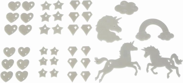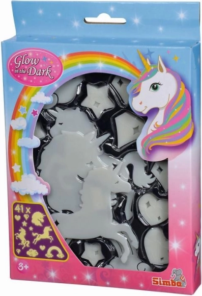 Rozzáří dětský pokoj sadu svítících dekorací do tmy s motivem jednorožce a dalších obrázků. Po krátkém nasvícení září ve tmě a snadno se připevní na stěnu, strop i nábytek. Balení obsahuje 41 ks a lepicí gumu pro jednoduchou instalaci.