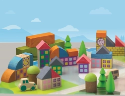 - 40 dřevěných kostek + herní podložka pro stavbu vesničky