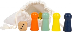 Dřevěná kostka a 16 barevných figurek jsou přehledně uloženy v textilním sáčku, který usnadňuje přenášení a skladování.