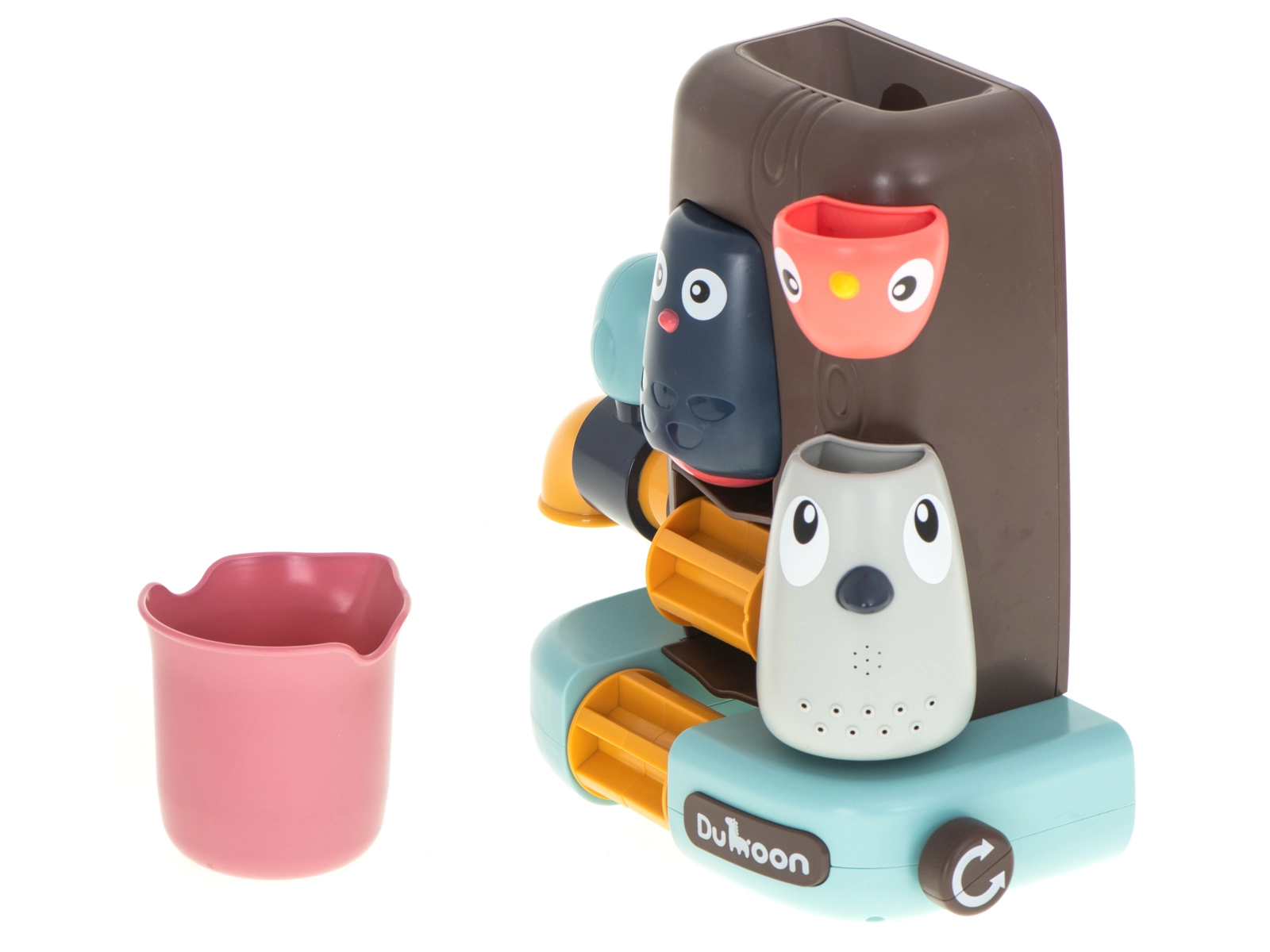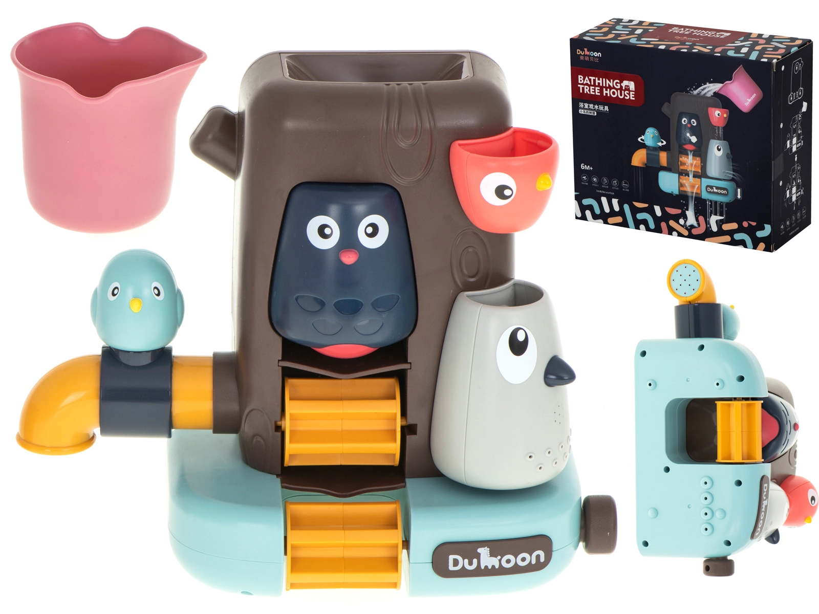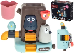 Veselý stromový domek s roztomilými ptáčky je ideální motivací pro děti, které koupání zrovna nemilují. Jednoduše jej připevníte na vanu nebo obklady pomocí přísavek, naplníte vodou z přiloženého kelímku a zábava začíná. Modrý ptáček ovládá kohoutek – otočením vodu zastavíte či pustíte, sova hlídá vodní mlýnek a šedý ptáček vytváří sprchový efekt díky jemným otvorům.