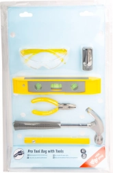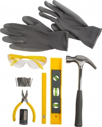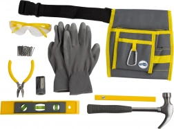 - Brašna na opasek, kladivo, kleště, pracovní rukavice (vel. 7), vodováha s magnetem, ochranné brýle, karabina, tužka, strouhátko, hřebíky