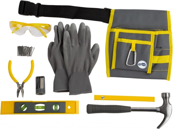 Praktická a odolná dětská brašna na pas od značky Small Foot s opravdovým nářadím umožní malým kutilům bezpečně pomáhat dospělým. Set obsahuje 10 dílů, včetně kladiva, kleští, pracovních rukavic (velikost 7), vodováhy s magnetickým páskem, ochranných brýlí, karabiny, tužky a strouhátka. Nastavitelný opasek zajistí pohodlné nošení a perfektní organizaci nářadí.