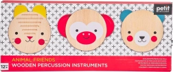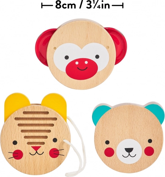 Tři jednoduché perkusní nástroje s motivy zvířátek podporují přirozené vnímání rytmu a radost z hudební hry už od raného věku.