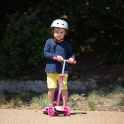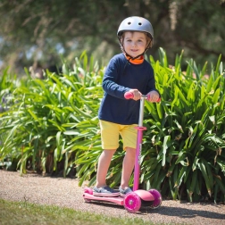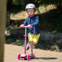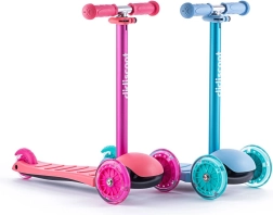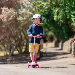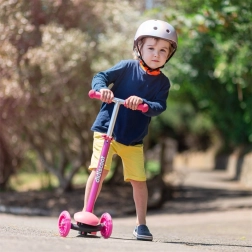 Řídítka jsou nastavitelná do třech výškových úrovní – 58 cm, 67 cm a 76 cm – což umožňuje koloběžce růst spolu s vaším dítětem. Je vybavena zadní brzdou pro zvýšení bezpečnosti během jízdy. Konstrukce kombinuje pevné a nezávadné plasty s lehkými slitinami, aby byla koloběžka lehká a snadno ovladatelná.