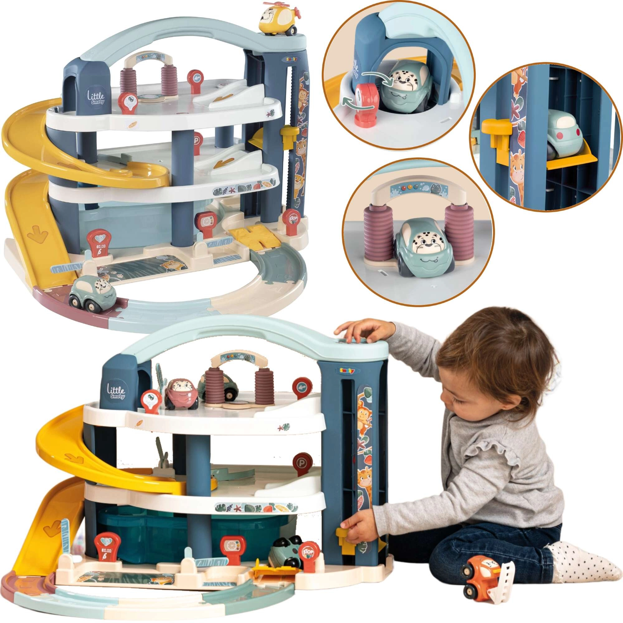 Objevte odolnou třípatrovou garáž Little Smoby s mega rampou, funkčním výtahem, myčkou, čerpací stanicí a heliportem. Součástí balení je autíčko a helikoptéra. Díky praktickému madlu se garáž snadno přenáší a má skrytý úložný prostor na autíčka. Ideální dárek pro děti od 18 měsíců, vyrobeno ve Francii.