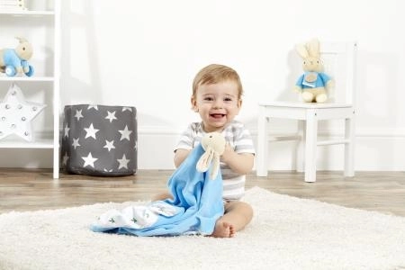 Roztomilý muchláček s králíčkem PETR RABBIT potěší každé miminko. Je měkoučký, příjemný na dotek a snadno se složí a zajistí knoflíkem. Zvenku je modrý, uvnitř zdobený ilustracemi podle Beatrix Potter. Ideální jako dárek k narození nebo křtinám.