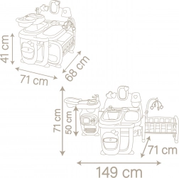 V kuchyňském koutku najdete dřez s kohoutkem, hrnce, talíř a lahvičku na krmení. Koupelna je vybavena vyjímatelnou vaničkou, sprchou, přebalovacím pultem a důmyslnými uchyty pro lahvičky a obrázky. Ložnice obsahuje kolébku s kolotočem a lampičku se svítícím stínidlem.