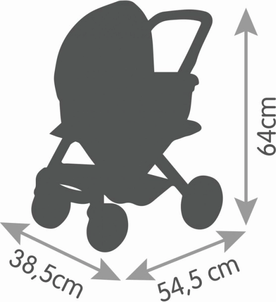 Robustní potahy z plastové tkaniny jsou odolné a snadno udržovatelné – stačí je otřít vlhkým hadříkem. Otočná přední kolečka a protihluková vrstva na kolech se postarají o plynulý, tichý a stabilní pohyb doma i venku. Vhodné pro panenky do 42 cm (panenka není součástí balení).