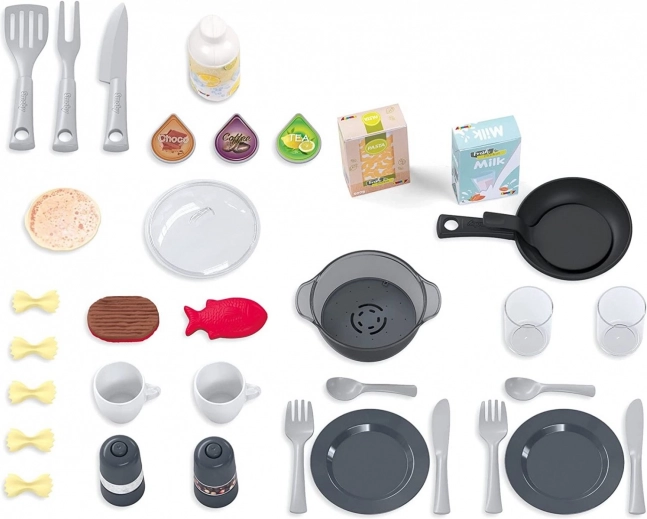 Součástí je bohatá sada 34 kusů příslušenství – hrnec s poklicí, pánev na lívance, mlýnek na sůl a pepř, nádobí a příbory pro dvě osoby, kapsle do kávovaru, kuchyňské náčiní, pořadač do myčky i makety potravin. Otočná kontrolní kolečka, otevírací dvířka trouby a lednice a typický zvuk „cric cric“ u výrobníku sodovky podporují realistickou hru.