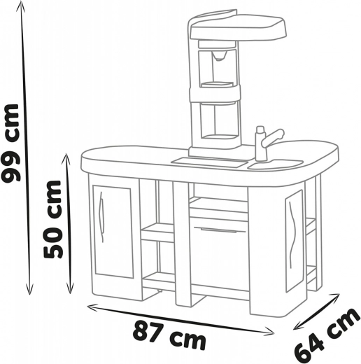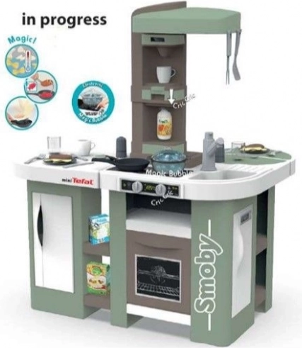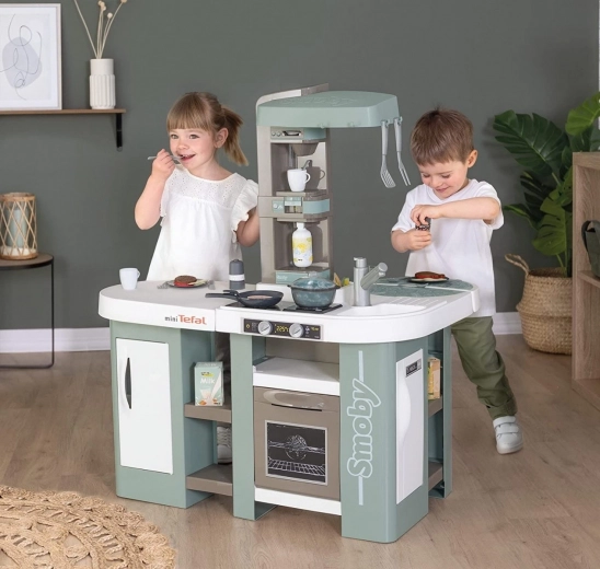 Tato prostorná kuchyňka inspirovaná značkou TEFAL nabízí vše pro autentickou hru: pracovní desku, dřez s baterií, kávovar na kapsle, výrobník perlivých nápojů, troubu, myčku, lednici a otevřené poličky. Elektronická funkce magického hrnce po nalití vody a stisku tlačítka vytváří skutečné bublinky, které uchvátí každého malého kuchaře.