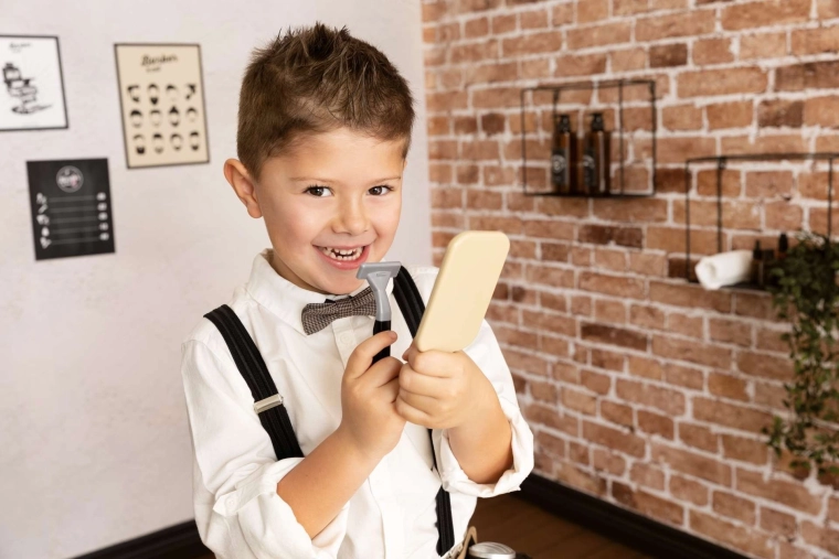 Zrcátko, nůžky, hřeben, štětec, holicí strojek a další příslušenství poskytují hodiny bezpečné, kreativní zábavy pro děti od 3 let.