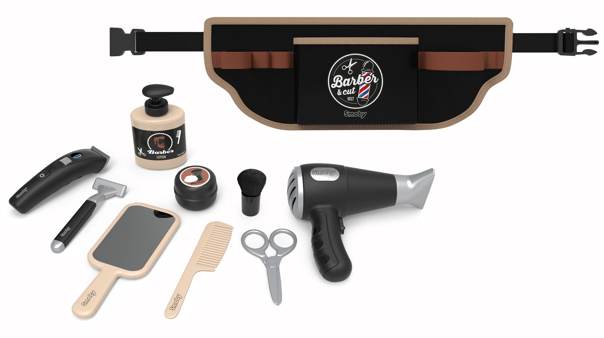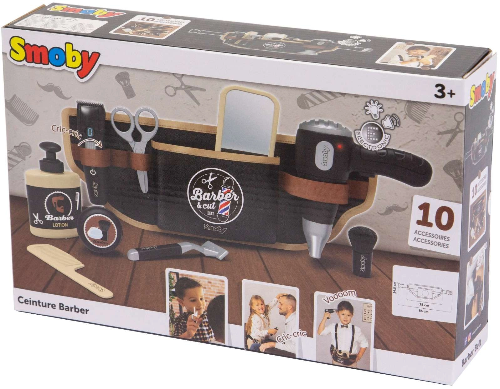 Kadeřnický pás pro děti Smoby myBeauty promění každý den v zábavné salonní dobrodružství. Díky nastavitelnému opasku mají děti všechny pomůcky bezpečně uložené a vždy po ruce – od fénu přes nůžky až po hřeben a holicí strojek. Interaktivní fén vydává realistické zvuky, takže hra působí jako doopravdy.