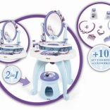 Toaletní stolek 2v1 inspirovaný Ledovým královstvím nabízí vše, co malé princezny potřebují pro svou každodenní péči. Obsahuje velké otočné zrcadlo a bohaté příslušenství, jako jsou parfémy a další kosmetické doplňky.