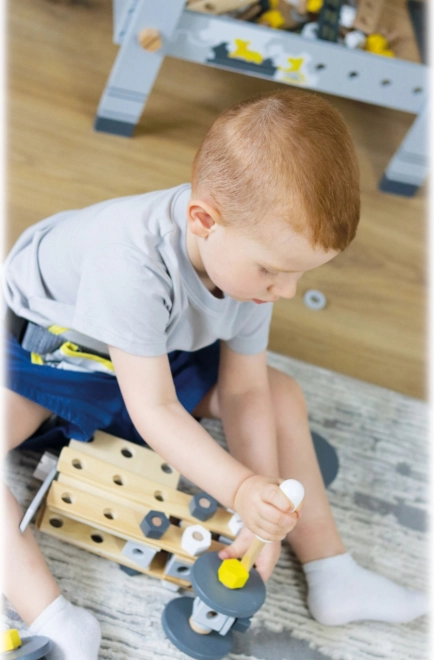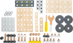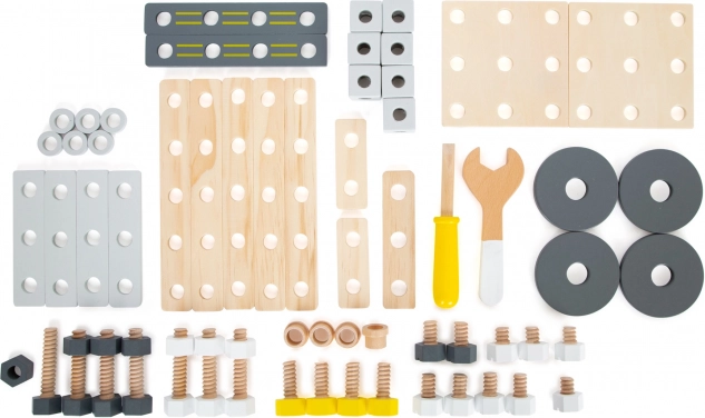 Součástí balení je bohaté příslušenství: konstrukční lišty a desky s předvrtanými otvory, kostky, kola, adaptéry kol, distanční pouzdra a dva dřevěné nástroje – klíč a šroubovák. Vše přehledně uložíte do praktického boxu, takže se žádný dílek neztratí.