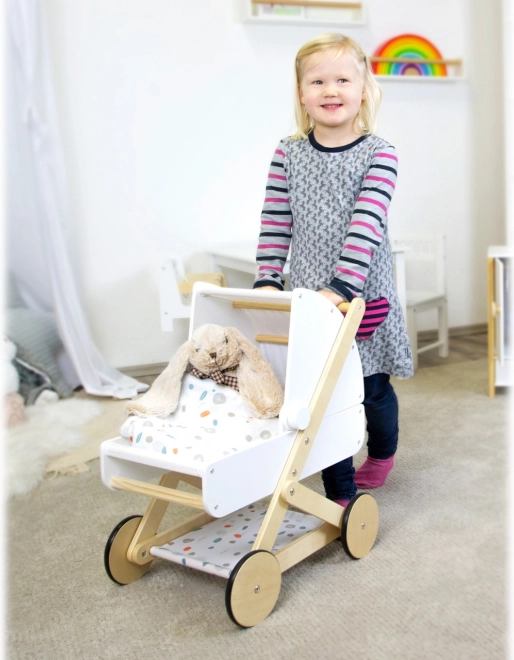 Objevte kvalitní kočárek pro panenky, který skvěle zapadne do každého dětského pokoje. Kombinuje přírodní dřevo, odolné a omyvatelné textilie a jemnou paletu barev. Nízká váha a stabilní konstrukce zaručí bezpečnou jízdu, zatímco pogumovaná kolečka se postarají o tichý provoz na jakémkoli povrchu.