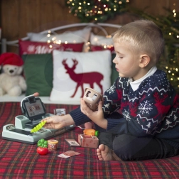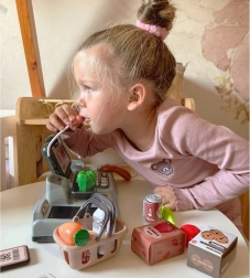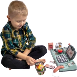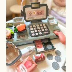 Pokladna zahrnuje terminál, díky kterému může dítě provádět platby hotovostí, kartou nebo smartphonem, stejně jako dospělí v obchodě. Integrovaná váha a pohyblivý pás umožňují dítěti uspořádat nákupy a zažít skutečnou roli prodavače.