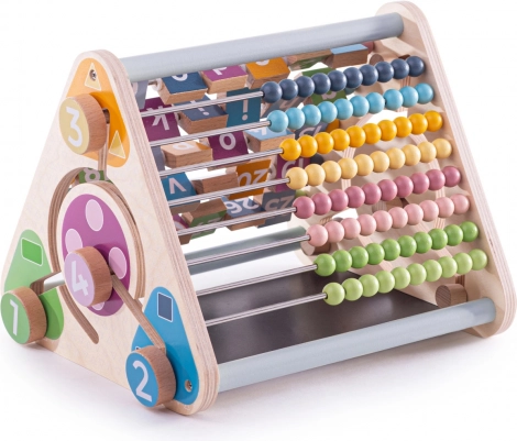 Kombinace počítadla, otáčecích kostek s abecedou a zvířátky, čísel a křídové tabule podporuje přirozené učení a dlouhou zábavu.