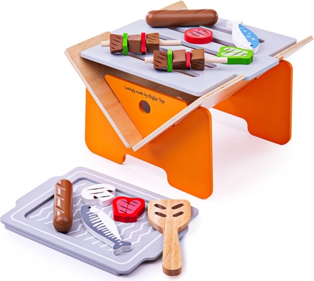 Udělejte si zahradní párty s dřevěným stolním grilem od Bigjigs Toys! Obsahuje 10 kusů jídla, obracečku, tác a uhlíky. Snadné sestavení bez šroubků. Vyrobeno z udržitelných materiálů.