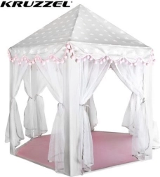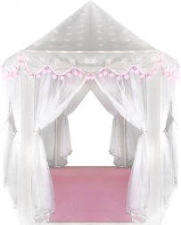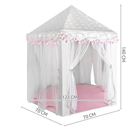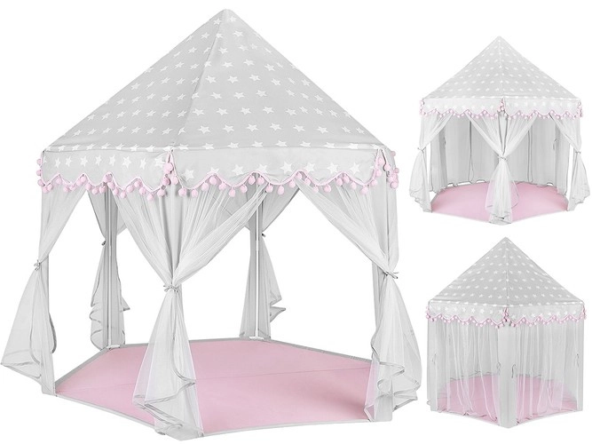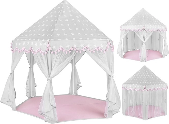 Vytvořte dětem bezpečný koutek pro odpočinek i fantazijní hry. Stan má kuželovou střechu, 6 otevřených vstupů se světelnými, prodyšnými záclonkami a stylový šedo‑růžový design s hvězdičkami, který zapadne do dětského pokoje i herního koutku. Díky lehké konstrukci na zacvaknutí ho sestavíte během chvilky a stejně snadno přenesete či uložíte.