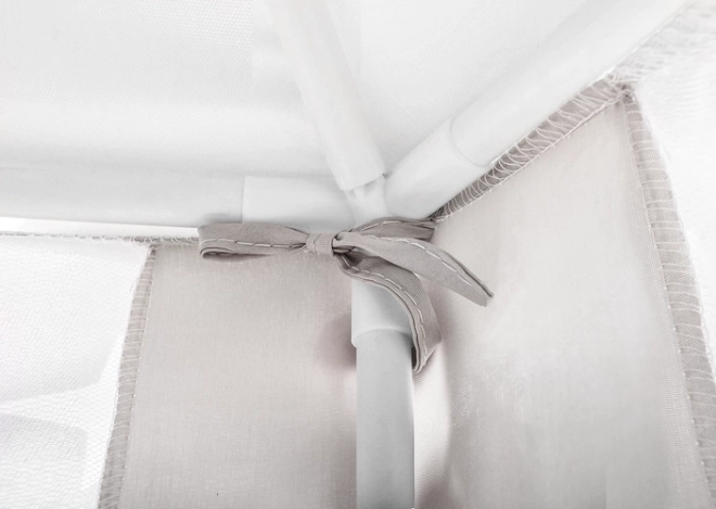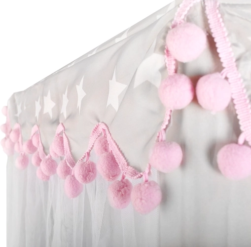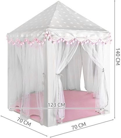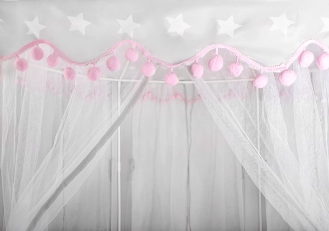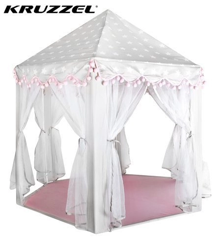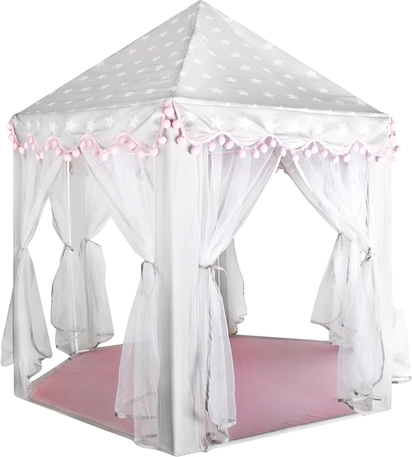 Prostorná podložka a vzdušné bočnice zajistí komfort pro jedno i více dětí – vejde se sem spousta polštářků, plyšáků i knížek. Stan se skvěle hodí do interiéru i na zahradu pod dohled dospělých. Dekorativní pompony a možnost zavázání záclonek na mašle dodají hře šmrnc i soukromí.