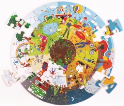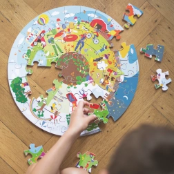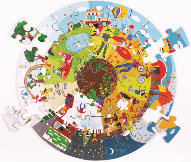 Dětské kulaté podlahové puzzle od Bigjigs Toys přináší jedinečný způsob, jak se děti mohou seznámit se sezonními změnami. Každý dílek puzzle je precizně navržen, aby vytvářel celkovou 360 stupňovou scénu, představující různorodé aktivity a krajiny typické pro jaro, léto, podzim a zimu.