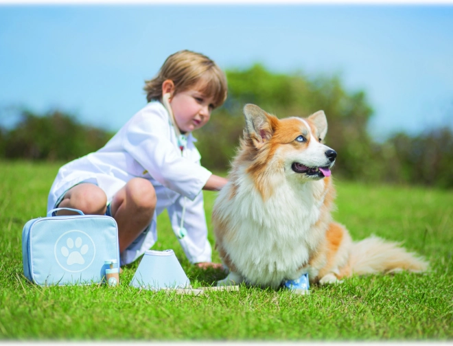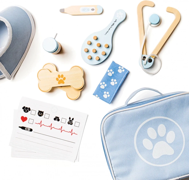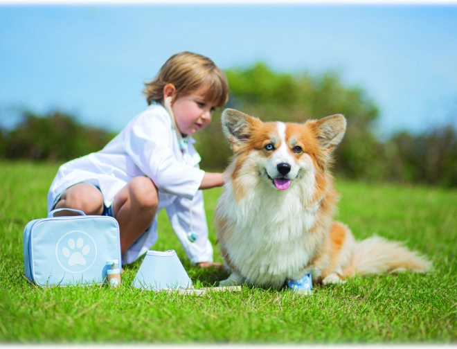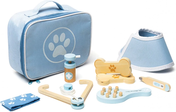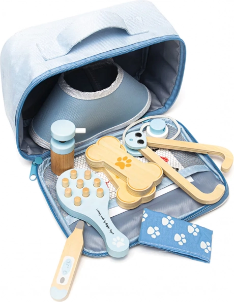 Kompletní veterinární kufřík dětem umožní pečovat o plyšáky i figurky mazlíčků jako opravdový doktor. V sadě nechybí nástroje jako stetoskop, teploměr, otoskop, injekční stříkačka, obvaz, kartáč, ochranný límec a další doplňky. Vše je uloženo v odolné textilní brašně s tlapkou, ideální pro přenášení i skladování.