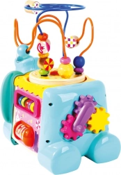 Tato vícefunkční motorická kostka ve tvaru slona je ideální edukační hračka pro nejmenší. Díky barevným prvkům a rozmanitým aktivitám děti přirozeně trénují jemnou motoriku, prostorové vnímání a senzorické dovednosti. Vrchní část tvoří motorický labyrint s korálky, boky zdobí ozubená kolečka, posuvné dílky a další chytré úkoly.