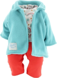 Obleček Petitcollin Arthur promění každou panenku o velikosti 36 cm v elegantního parťáka na hraní. Sada kombinuje tyrkysovou fleecovou mikinu, veselou vzorovanou blůzu, červené krátké kalhoty a ladící čepičku – dohromady vytváří atraktivní a pohodlný outfit pro každodenní dobrodružství.
