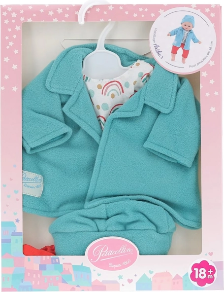 Stylový obleček pro panenku 36 cm od značky Petitcollin v designu Arthur: tyrkysová fleecová mikina, vzorovaná blůza, červené kraťasy a čepička. Kvalitní zpracování, francouzská elegance a pestré barvy podpoří fantazii i radost z hry, zatímco snadné oblékání zvládnou i malé ručičky.