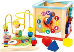 Tato barevná dřevěná motorická kostka nabízí dětem od 12 měsíců mnoho způsobů, jak si hrát a současně se učit. Díky hodinám s ručičkami se děti hravou formou seznámí s časem, korálkový labyrint rozvíjí úchop a koordinaci a další strany kostky procvičují logiku, tvary i barvy.