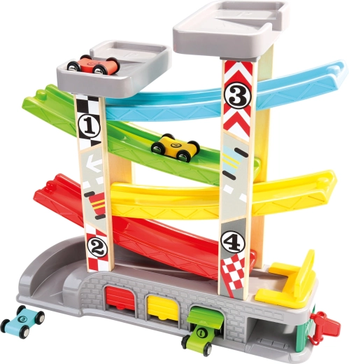 Barevné rampy umožňují plynulý sjezd autíček z vrchních plošin do spodních garáží, ideální pro první závody a rozvoj koordinace.