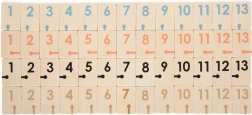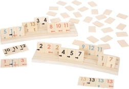 - dřevěné číselné dílky, žolíky, dřevěné stojánky, kartonový box