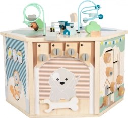Motorická interaktivní kostka SMALL FOOT Pets XXL je promyšlené vzdělávací centrum pro nejmenší. Osm herních panelů rozvíjí jemnou motoriku, hmat i sluchové vnímání a díky detailním ilustracím přibližuje dětem každodenní život zvířat. Děti zde objeví korálkový labyrint, vkládačku, otočné destičky, provlékačku / třídění barev, skládanku a další interaktivní prvky, které podporují soustředění a logické myšlení.