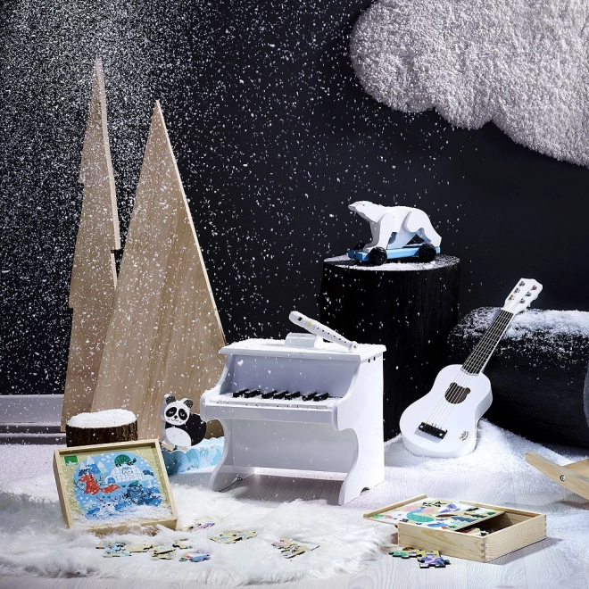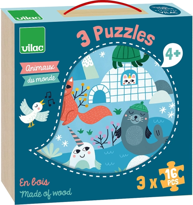 Tři obrázkové puzzle s motivy savany, lesa a ledové kry představí dětem svět zvířat v jejich přirozeném prostředí.