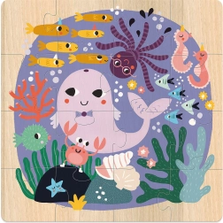 Objevte nádherný svět přírody prostřednictvím této sady dřevěných puzzlí. Každý ze tří obrázků zobrazuje jinou tematiku: hráče mezi oblaky, podmořský svět i dobrodružství v džungli. Scéna na obloze potěší krásným pávem, orlem a dalšími ptáky. Mořské motivy oživují velká velryba, chobotnice a přátelské rybičky. Pozemská scéna zahrnuje tygra, krokodýla a papouška ve veselém prostředí džungle.