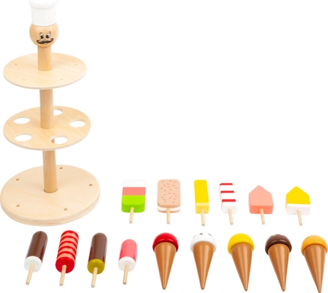 - Dřevěný zmrzlinový stojan s výběrem zmrzlinových dílků (kopečky a nanuky)