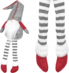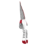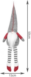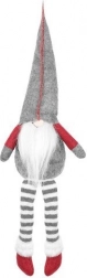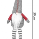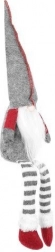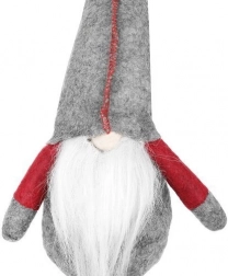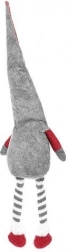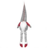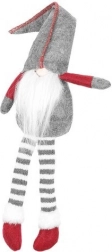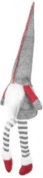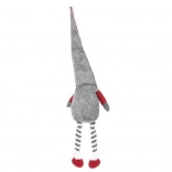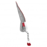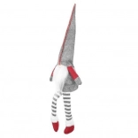 Textilní dekorativní skřítek v šedo‑červeném provedení má typickou vysokou špičatou čepici, dlouhé pruhované nohy a hebký bílý vous. Díky speciálnímu profilu na zadní straně sedí stabilně na hraně stolku či poličky a dodá interiéru hřejivý, útulný nádech.